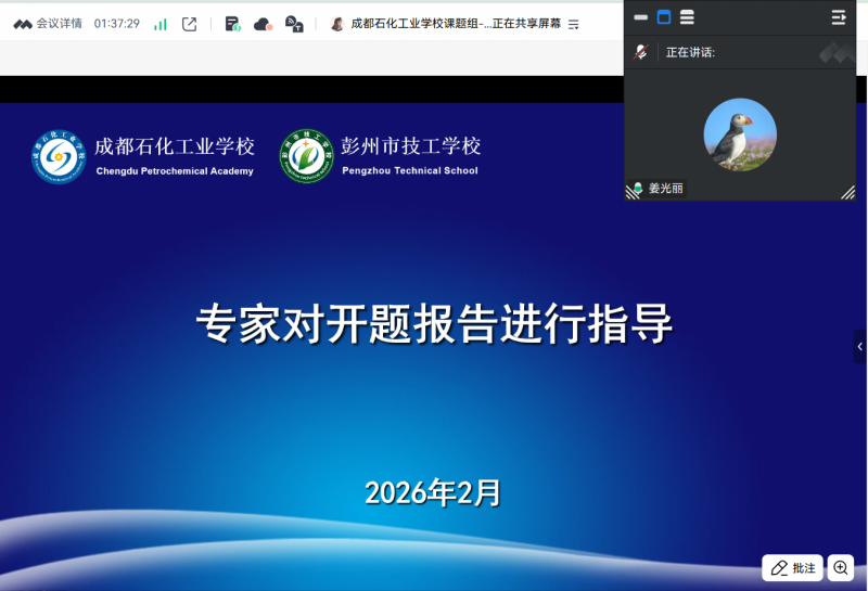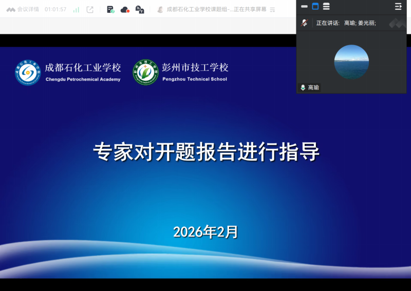 2026年2月7日成都石化工业学校(彭州市技工学校)精心谋划、稳步推进,以线上形式召开2025年四川省职业技术教育学会立项课题开题论证会,专题推进《项目式学习视域下中职学生工匠精神与劳动教育融合培育实践研究—以成都石化工业学校非遗传承项目为例》课题研究。廖大凯、姜光丽、高瑜、曾友州四位职业教育领域资深专家、学校蒙小建副校长及课题组成员参会,为课题研究把脉赋能。
