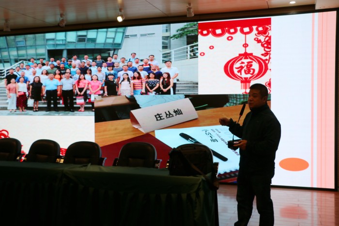 庄丛灿老师介绍了剪纸的起源、特点以及在国际交往中的纽带作用,指出剪纸艺术表达了广大民众的社会认知、道德观念、实践经验、生活理想和审美情趣,具有认知、教化、表意、抒情、娱乐、交往等多重社会价值。并即兴创作了几幅作品,每幅作用都被同学们哄抢一空。有的同学因座位靠后,看的不太清楚。干脆直接冲到第一排,席地而坐,细心观察,精心品味。