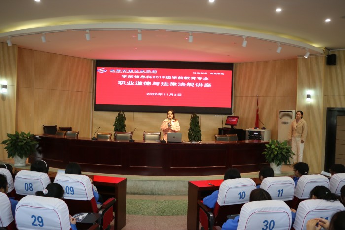 11月3日上午,成都石化工业学校学前信息科组织了“职业道德与法律法规”主题讲座,2019级学前教育专业全体学生认真聆听了彭州市实验幼儿园骨干教师王娟老师的精彩论述。
