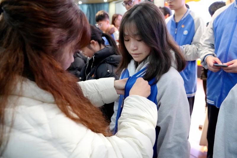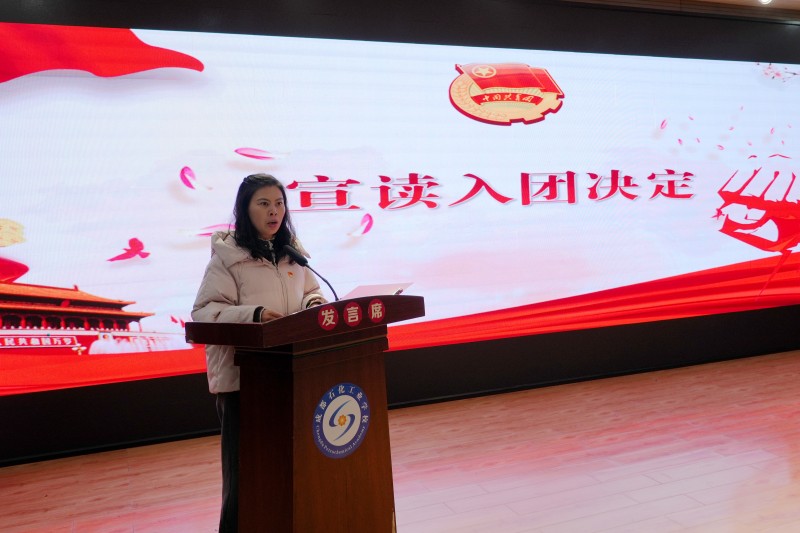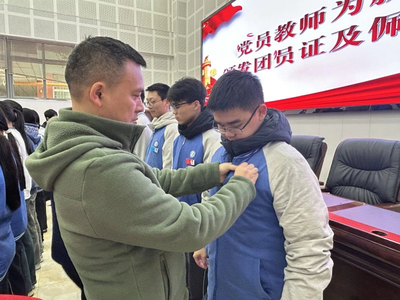 随后,党员教师代表们走上前,亲手为新团员们佩戴上闪亮的团徽。一枚小小的团徽,承载着沉甸甸的责任与荣耀。老师们仔细地为新团员整理衣冠,别上团徽,眼中饱含期许与鼓励。这一刻,是责任的传递,是使命的交接,更是党对青年殷切关怀的生动体现。佩戴着崭新的团徽,新团员代表25级化学工艺2班尹紫倩上台发言,表达了对加入团组织的无比激动与自豪之情,回顾了“一二·九”运动中前辈青年们的爱国壮举,并表示将以此为动力,时刻以团员标准严格要求自己,刻苦学习,锤炼品德,勇于实践,甘于奉献,努力成为有理想、敢担当、能吃苦、肯奋斗的新时代好青年,决不辜负组织的培养和师长们的期望。