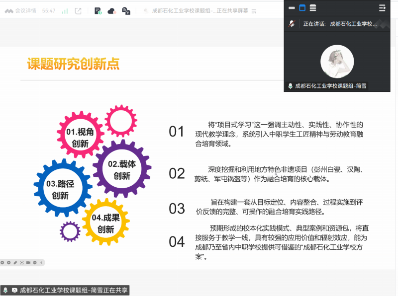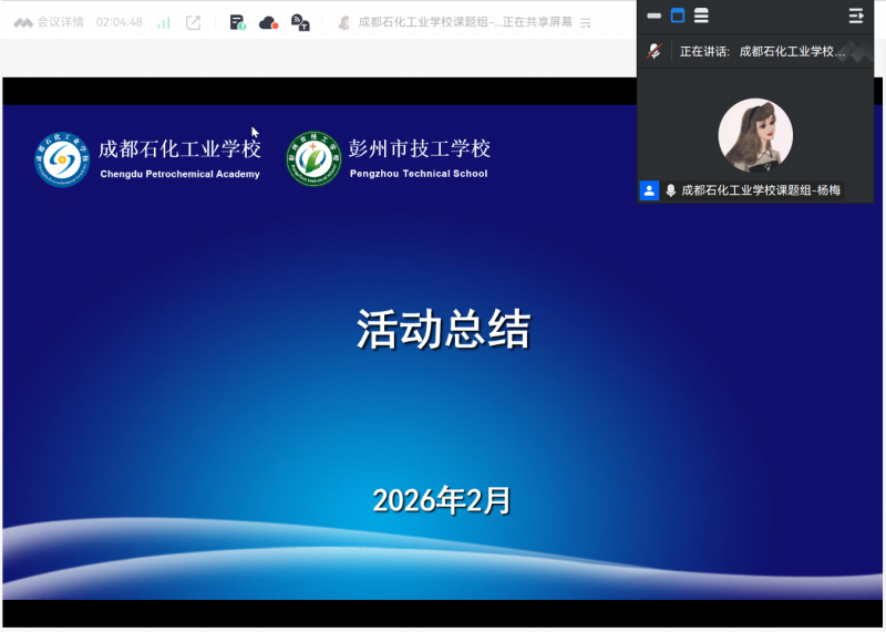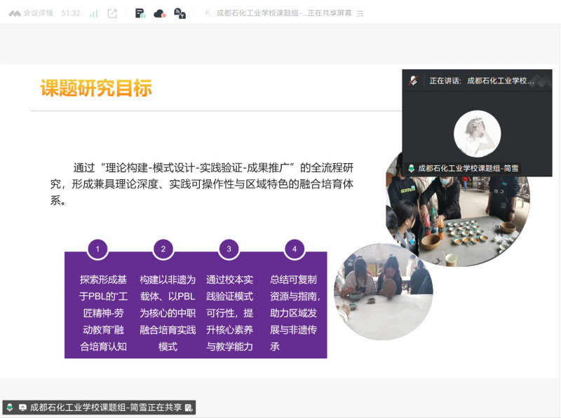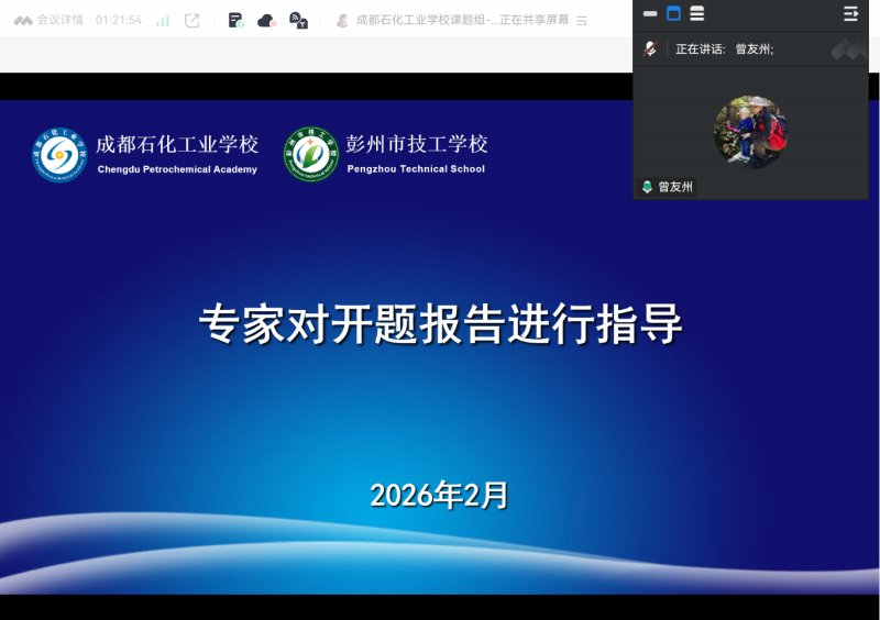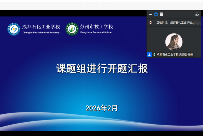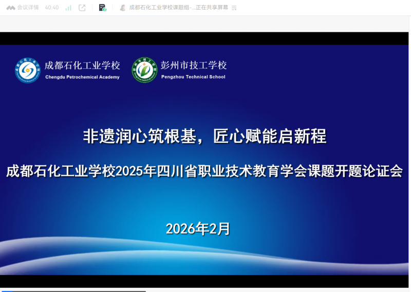 2026年2月7日成都石化工业学校(彭州市技工学校)精心谋划、稳步推进,以线上形式召开2025年四川省职业技术教育学会立项课题开题论证会,专题推进《项目式学习视域下中职学生工匠精神与劳动教育融合培育实践研究—以成都石化工业学校非遗传承项目为例》课题研究。廖大凯、姜光丽、高瑜、曾友州四位职业教育领域资深专家、学校蒙小建副校长及课题组成员参会,为课题研究把脉赋能。
