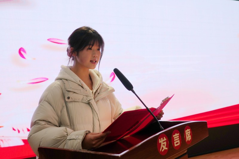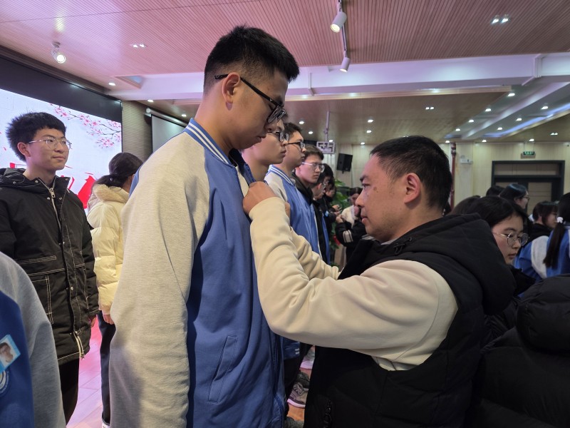 随后,党员教师代表们走上前,亲手为新团员们佩戴上闪亮的团徽。一枚小小的团徽,承载着沉甸甸的责任与荣耀。老师们仔细地为新团员整理衣冠,别上团徽,眼中饱含期许与鼓励。这一刻,是责任的传递,是使命的交接,更是党对青年殷切关怀的生动体现。佩戴着崭新的团徽,新团员代表25级化学工艺2班尹紫倩上台发言,表达了对加入团组织的无比激动与自豪之情,回顾了“一二·九”运动中前辈青年们的爱国壮举,并表示将以此为动力,时刻以团员标准严格要求自己,刻苦学习,锤炼品德,勇于实践,甘于奉献,努力成为有理想、敢担当、能吃苦、肯奋斗的新时代好青年,决不辜负组织的培养和师长们的期望。