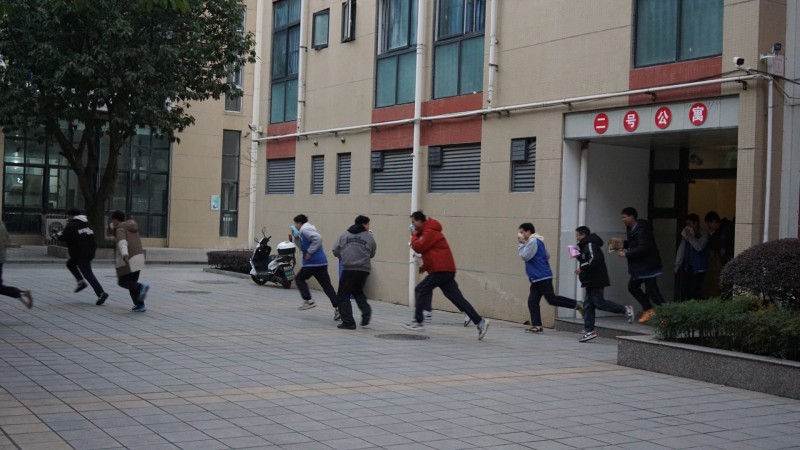 第二阶段为应急疏散演练。演练警报准时响起,各宿舍管理员迅速到位,引导学生用湿毛巾捂住口鼻,弯腰低姿,按照预设疏散路线快速、有序地向操场安全区域撤离。整个过程中,学生们听从指挥、不慌不乱,无拥挤、推搡现象。仅用时3分10秒,全体住校生便全部安全疏散至指定地点,各班级迅速清点人数并向演练总指挥汇报,演练达到预期效果。
